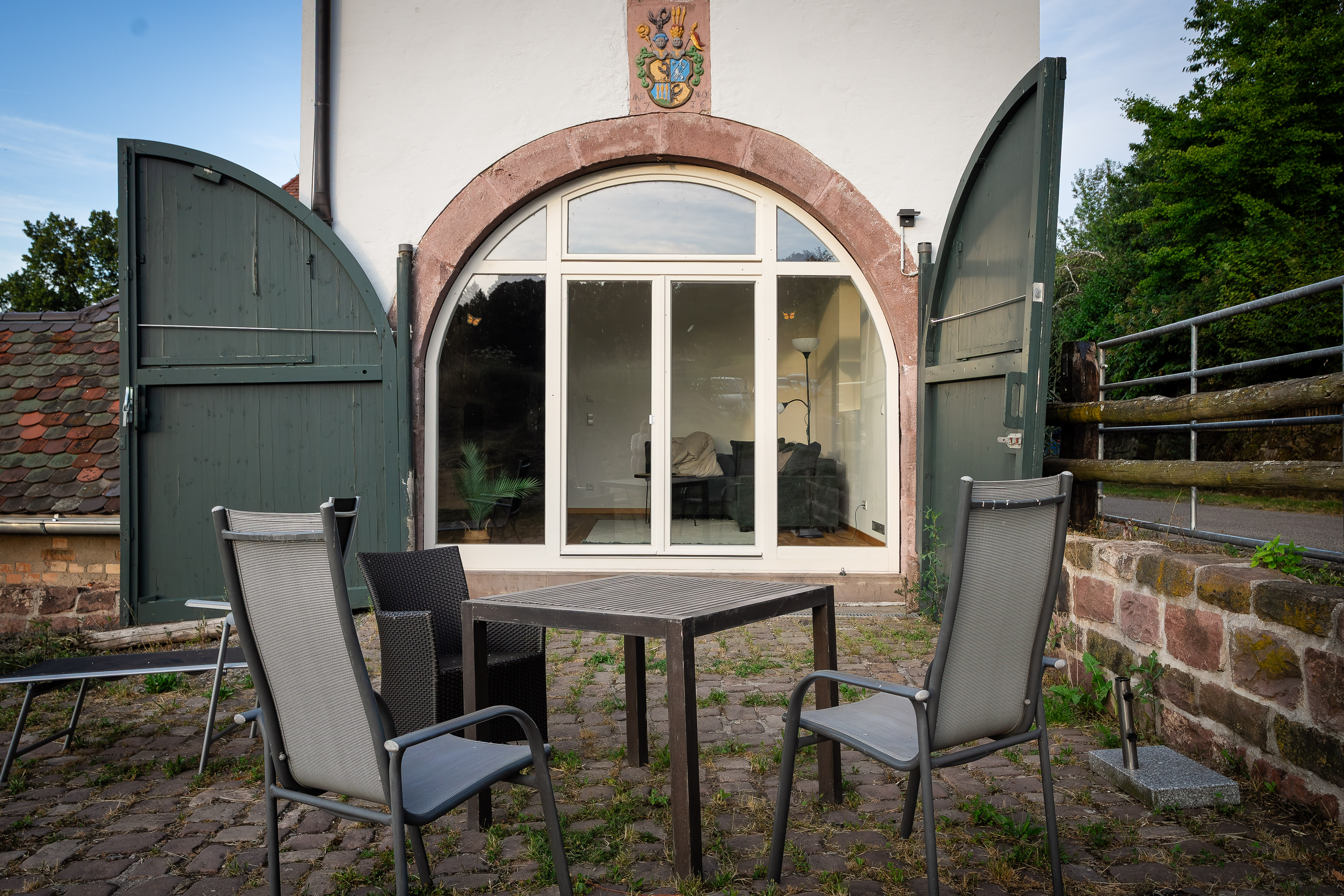 Unsere Ferienwohnung Wiesenblick ist 80qm groß und bietet ausreichend Platz zum Wohlfühlen für bis zu 3 Personen. Die Wohnung besticht durch das Wohnzimmer im ehemaligen Pferdestall mit modernisiertem Torbogen als Fensterfront. Weiterhin